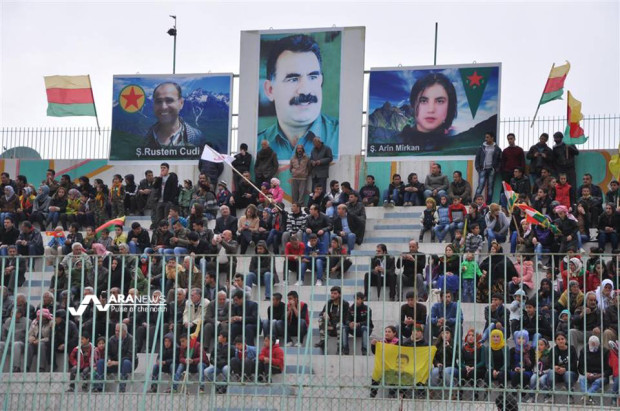 自治政府は昨日木曜の朝、「3月12日のインティファーダ」から11周年を記念して、新しい名称となったスタジアムの開所式を、民主社会運動(TEV DEM)の旗のもと、ジャジーラ地区と提携諸政党の幹部らが出席して開催した。スタジアムには1999年以来トルコで囚われの身となっているクルド労働党指導者アブドゥッラー・オジャランの写真と、自治政府所属の人民防衛部隊と女性防衛部隊の旗が掲げられた。